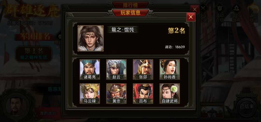 第二名是龍之·馄饨军团。龍之·馄饨军团的配备的武将是诸葛亮、赵云、张郃、孙尚香、马云禄、黄忠、吕布+3个自建。