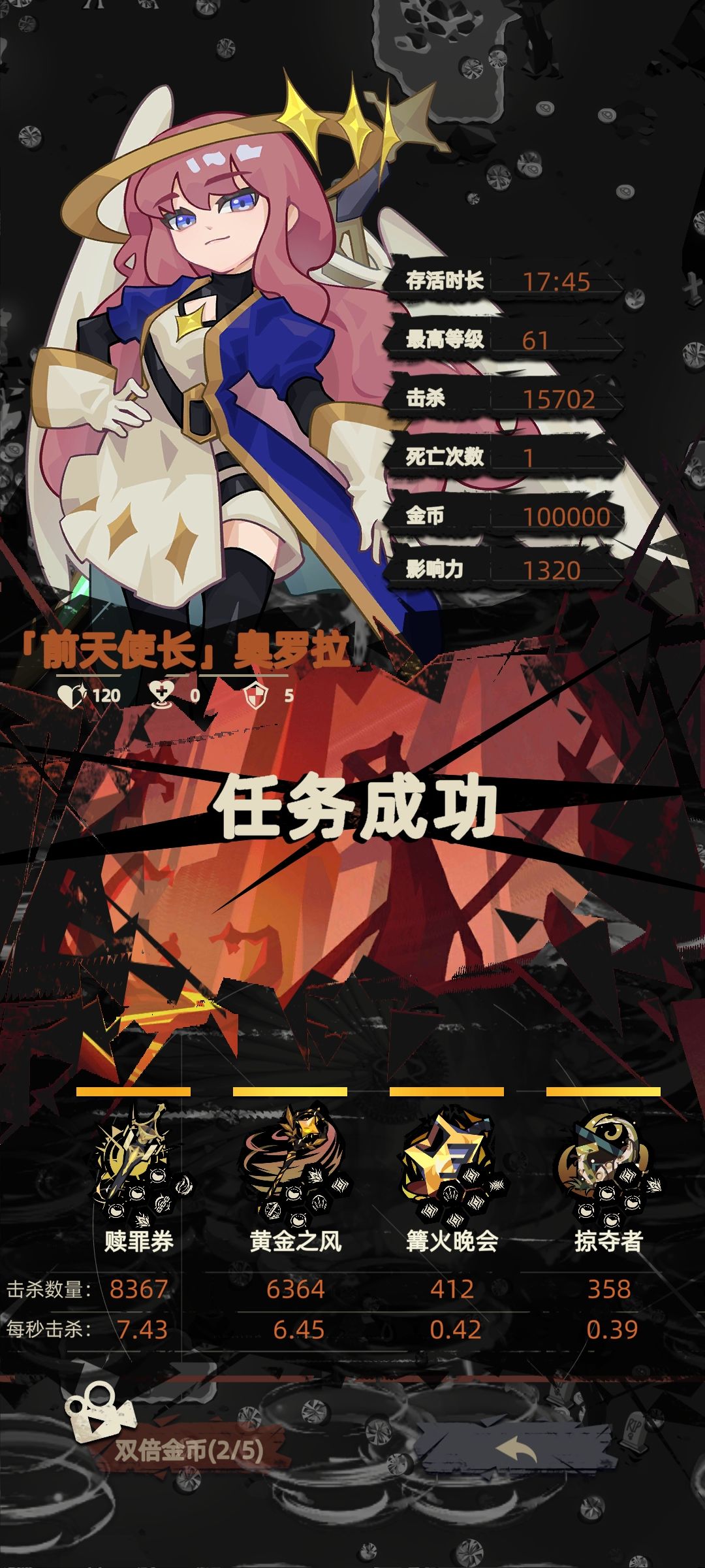 补充一下,怎么看是否能成功刷钱?当你站在原地,怪物碰不到你,且原地挂机时,经验不会涨!这点非常重要,这意味着你升级拿到的每一笔钱都是否能翻倍!如果能做到,那么剩下就交给运气了,箱子给的金币越多封顶的几率有就越大了(磁铁能留则留也很关键!)