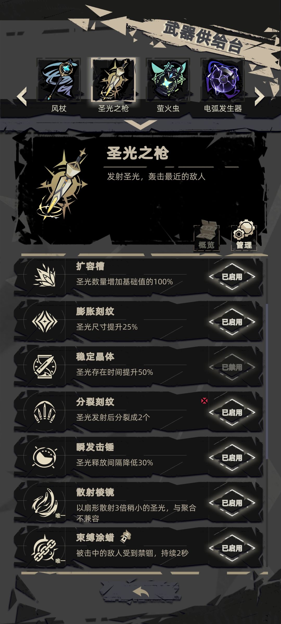 攻速yyds,加上一个数量进化后就是18道激光,120°扇形禁锢配上攻速基本就可以挂机了(可以考虑带分裂,但是会导致怪物掉落的混乱太广没磁铁吃不过来)