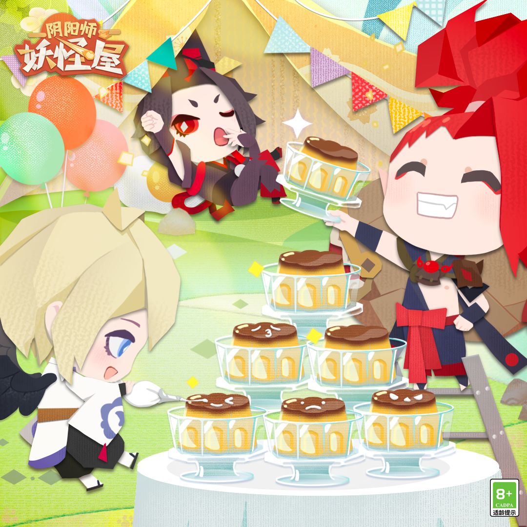 为了迎接周年庆,崽崽们在庭院里搭建起了甜品台,而酒吞童子和大天狗似乎对布置有不一样的想法……画着各式表情的鸡蛋布丁垒成一座小塔,令人食欲大开!