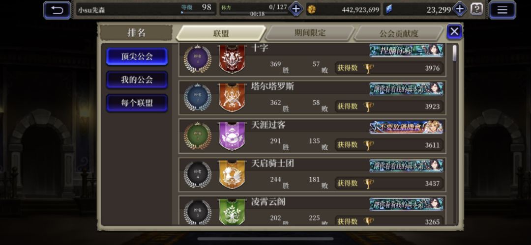 前十公会凌霄云阁,收高战力玩家和活跃新人,会指导发车带人,所属所有的公会兵舍都有5级+。