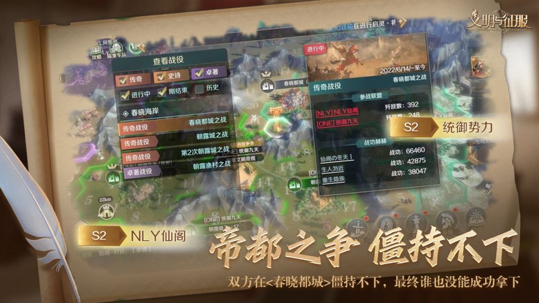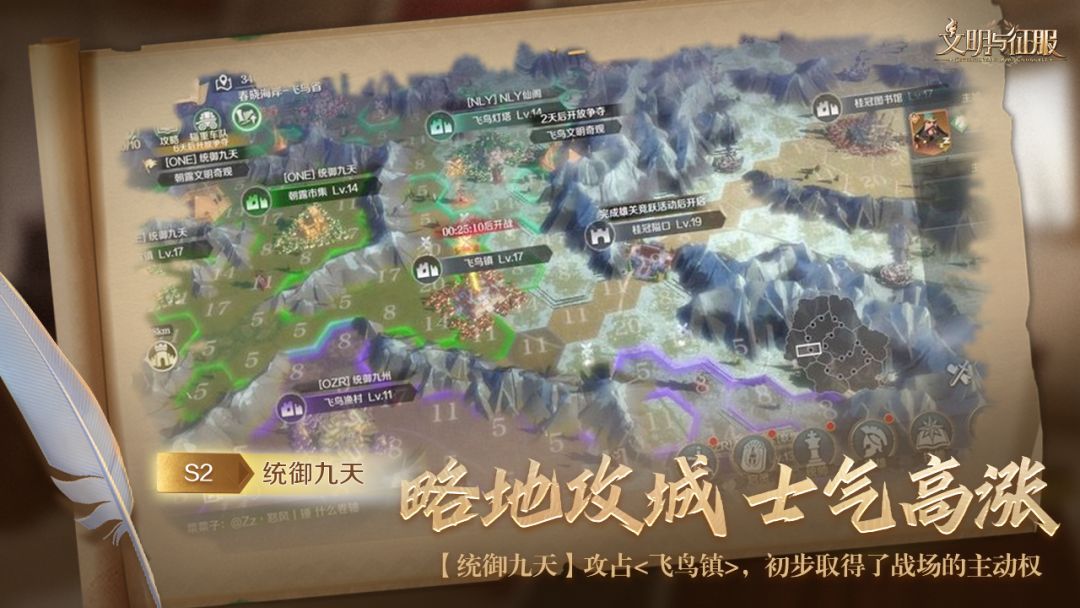 二赛季伊始,【NLY仙阁】与【统御九天】主力皆落地<春晓海岸>,双方很快接壤并且产生激烈的领土争夺战。抢先占领<朝露城>的【统御九天】见【NLY仙阁】迟迟没有拿下<晨花城>完成立国,便开始不断向着<晨花城>与<春晓都城>推进;【NLY仙阁】同样不甘示弱,迅速出动兵力围绕着<晨花城>、<朝露城>、<春晓都城>三城之间的土地与对方展开争夺。