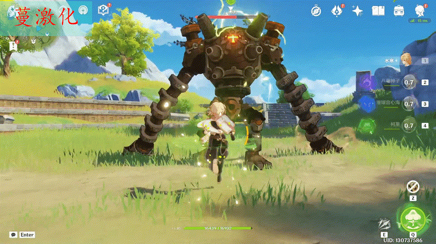 之前也说过,激元素和雷元素是会共存的,若此时再用草元素攻击的话,就会同时发生原激化反应和蔓激化反应。原激化反应会产生新的激元素,新的激化状态的激元素附着量会取新老两者中元素附着量最大的那个。比如原来就残留了1.5的激元素附着量,而后续的原激化反应只产出1.0的元素附着量,那么新激化状态的激元素附着量还是取1.5。