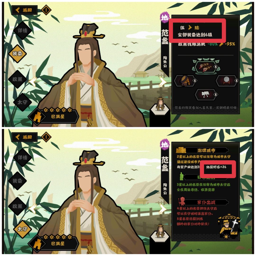 图中所示为5级装备的范蠡,6级装备的话是加30的好感,什么概念呢?大概就是你一个城市有3个3级坊市,让范蠡上任,可以直接让一个刚跟你打完仗的好感度为0的国家,直接变成好感度90。