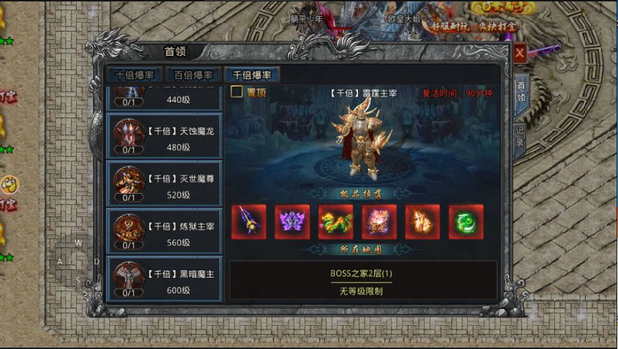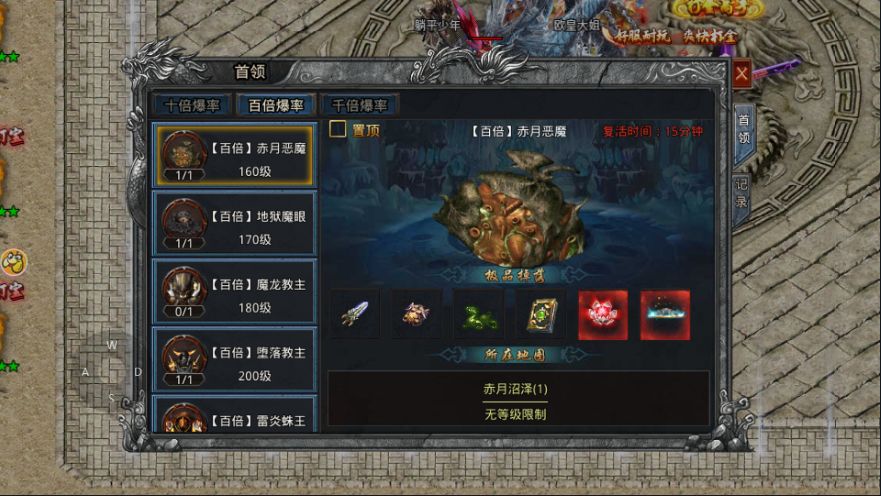 首领分为:十倍爆率,百倍爆率,千倍爆率。级别越高爆率越好。