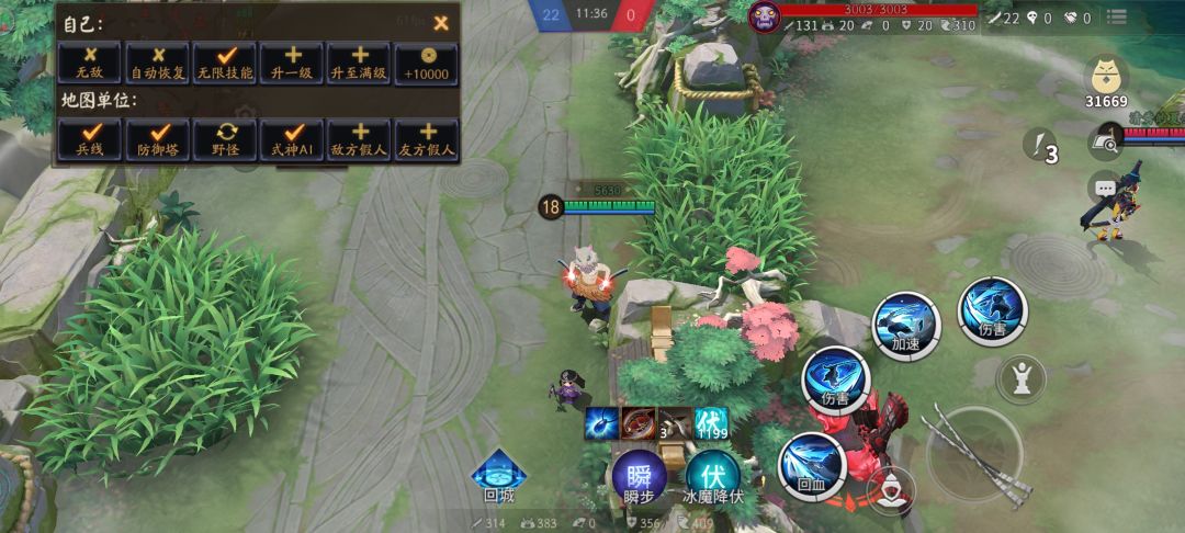 效果如图,被动准备就绪时,在回城图标上方有个新图标。此时,猪猪在草丛外边,草丛和草丛另一侧属于战争迷雾,无视野。