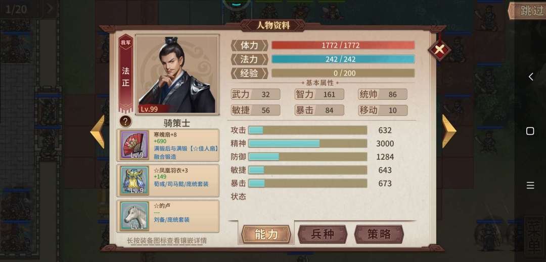 3. 任意一骑策,我选了法正,可以提供回归,装备寒魄扇,可以反击吸血,配的卢。