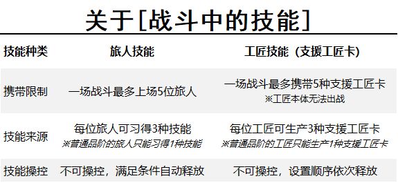 该说的表里都说了。很明显《工匠与旅人》的战斗策略类型属于战前策略,也就是在战斗之前,针对敌人阵容选定我方参战的旅人以及携带的支援工匠卡,战斗开始后将全自动演算直至一方战败。
