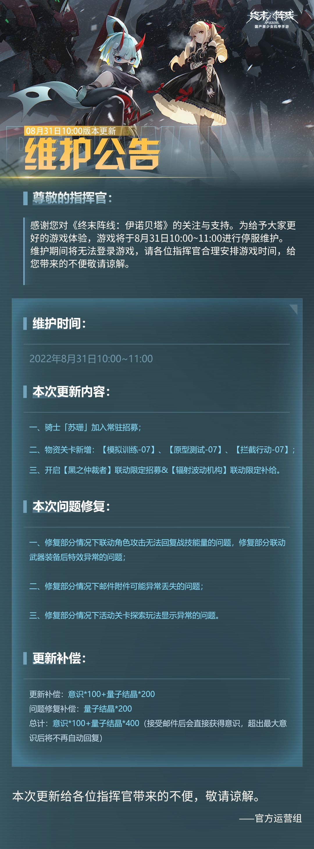 [终末阵线:伊诺贝塔]8月31日停服更新公告