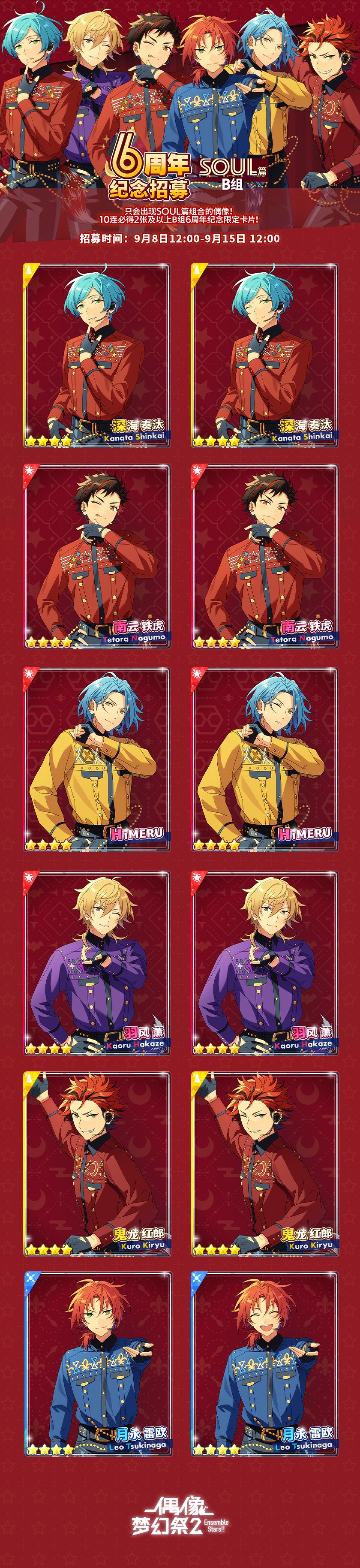 ●6周年纪念招募卡池只会出现SOUL篇组合的偶像。10连必得2张及以上B组6周年纪念限定卡片