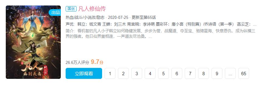 因其在剧情、画面、打斗等方面完美呈现了原著的修真世界,《凡人修仙传》动漫自上线来广受关注,被誉为“国漫之光”,评分高达9.7,追番人数超650万,播放量已逾10.7亿。