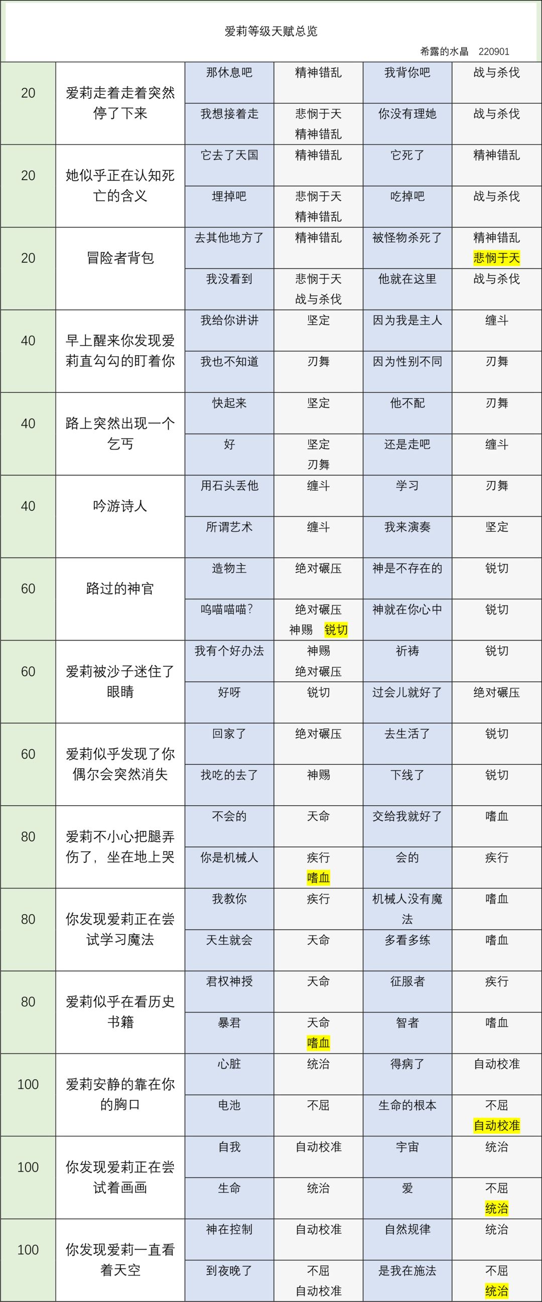 该表格数据为个人20只100级爱莉及评论区各大佬分享的数据所探明的数据,因为样本过少,部分选项仅选择过一次,所以可能会出现跟着表格选也出现其他天赋的情况。
