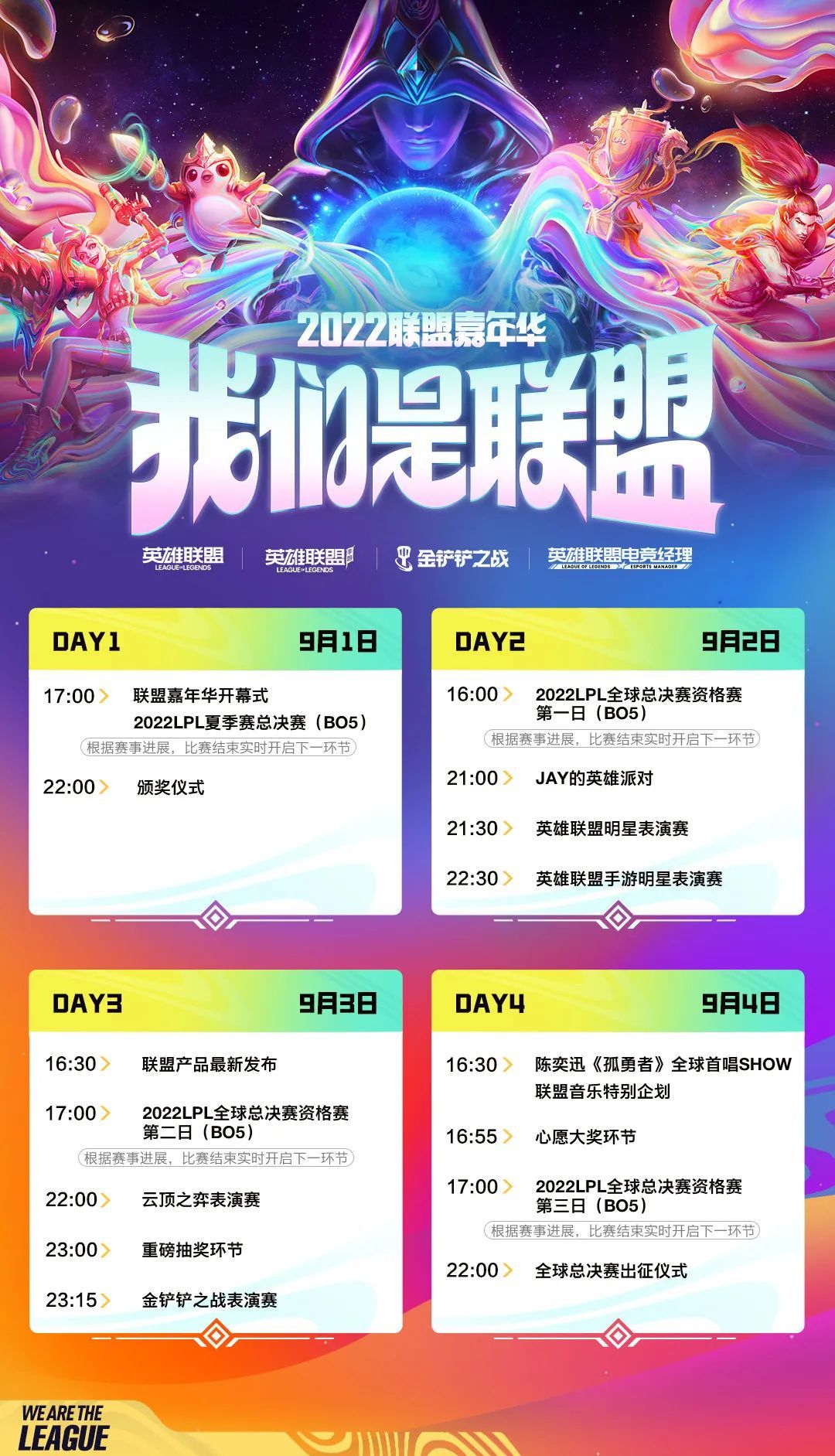 2022联盟嘉年华暨英雄联盟11周年庆典将在9月1日-9月4日正式拉开帷幕!隆哥也为大家带来了新鲜出炉的正式节目单,帮助召唤师们快速了解节目安排~