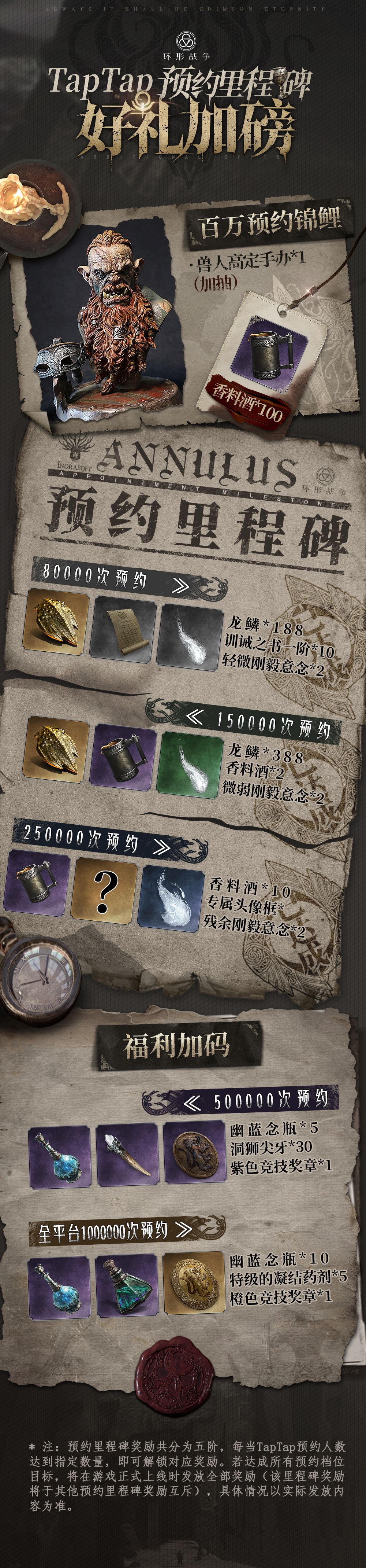 新增TapTap50万、全平台100万预约档位奖励,百万预约加抽香料酒*100+定制兽人手办*1!话不多说,马上下滑查看,邀请你的好友来打卡预约吧~
