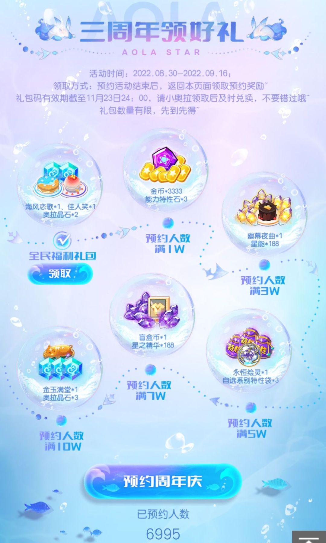 参与方式:点击活动链接蓝色字体,下拉点击预约周年庆,手机号登录,提示预约成功即可,本次活动无需绑定游戏ID,到时候回到这个界面领取礼包码即可进入游戏兑换奖励,活动正式开启后可能还有正式奖励,如三周年纪念服装等