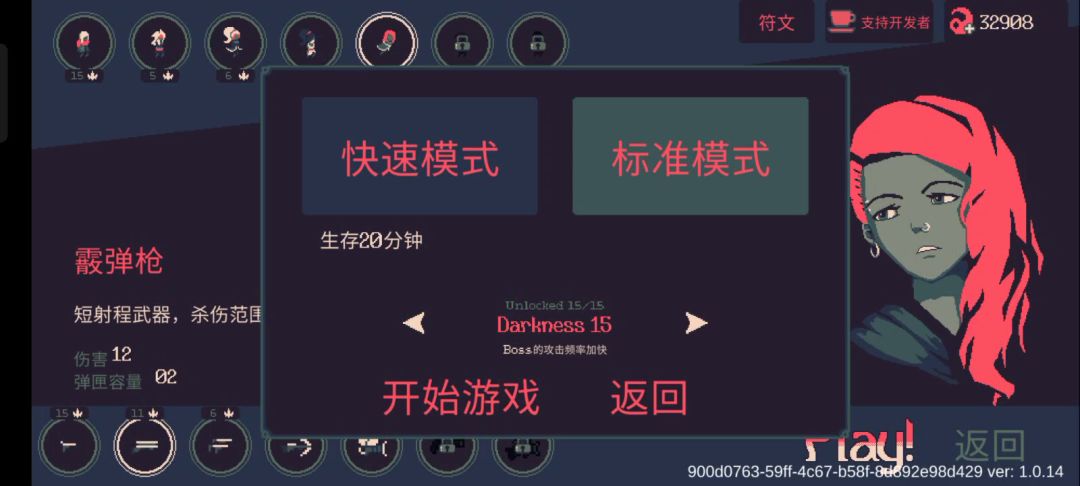 霰弹枪-全场难点在打狗,第一个BOSS的宝箱先不要捡(怕出减子弹伤害),打狗前点子弹伤害类和保命类,最好能点出冰霜附魔,打完狗就随意发挥都能通关,打狗看6分18秒。