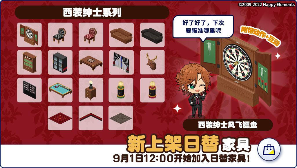 9月1日12:00 起将上架「西装绅士系列」,此家具系列单件家具会随机出现在每日替换家具中,其中【西装绅士风飞镖盘】附带新的动作及互动。