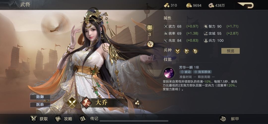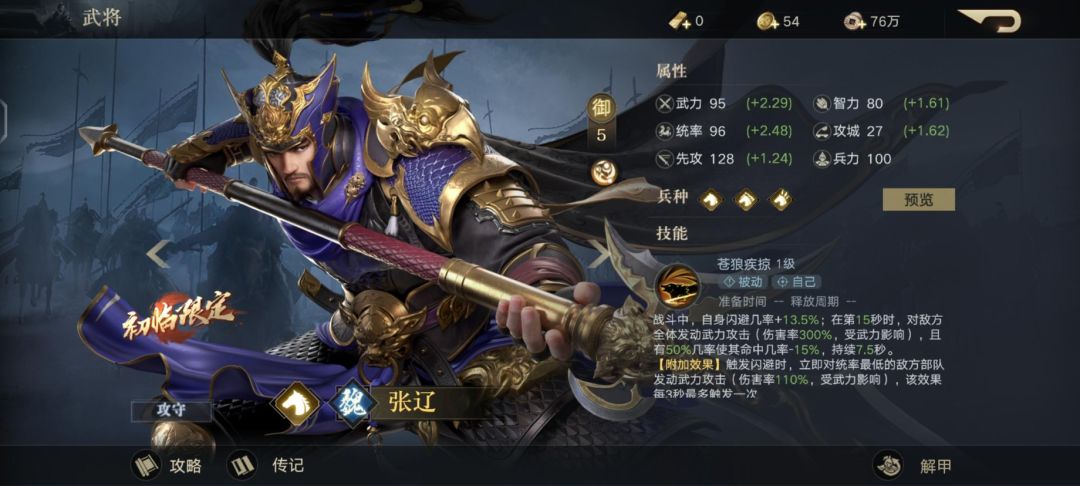 武力 68 (+0.97)智力 90 (+1.71)统率 69(+1.38)攻城 55 (+2.87)先攻 84(+0.83)人物技能:受到来自男性所领部队的伤害-10%,每隔7.5秒,使兵力比最低的2支我方部队回复一定兵力 (回复率120%,受智力影响)解析:主要就是提档男性部队的伤害,加上张辽的闪避躲点控制能能给这个阵容效果拉满