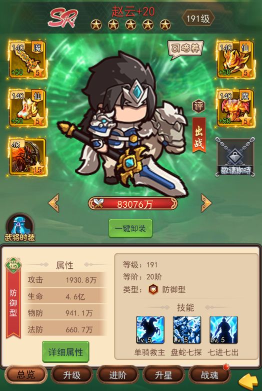 三技能七进七出,当自身施放主动技能或普通攻击时将提升自身攻击和双防,若叠满20层,赵云将成为可攻可守的全能战士,并且我方每阵亡一名武将,赵云将提升自身命中、暴击、和吸血,大幅提升自身作战实力,愈战愈勇。
