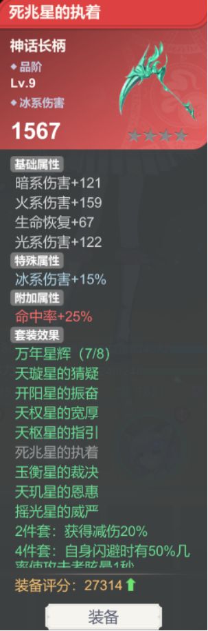 万年星辉的八件套特殊栏的词条提供大量的冰暗加成,与安娜天赋需求的双系伤害一致,契合度很高,而激活套装效果后,提供的闪避,能让低血量的安娜存活率大幅度增幅,出2件套的泛用性外,4、6、8件套对安娜残血状态时提供的帮助非常高。