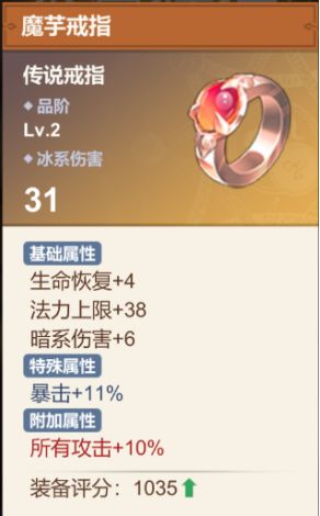 例如这个魔芋戒指,主词条的冰系伤害副词条包含了暗系伤害,特殊词条中还夹杂这暴击词条,这对于安娜来说就是一件极品的装备。