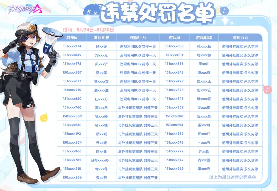 现将8月24日-8月30日的部分违禁处罚名单进行公示:
