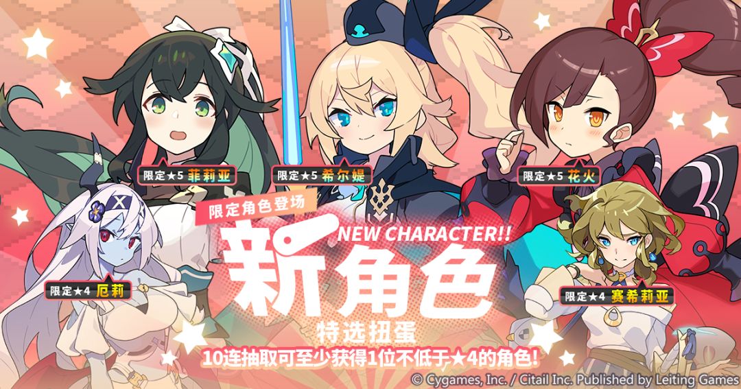 本次周年活动期间,我们会开放限定★5角色 光与愿的继承人「菲莉亚」、星之少女骑士「希尔媞」、星花忍者「花火」的特选扭蛋池,为期11天。