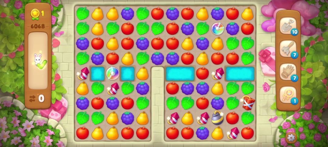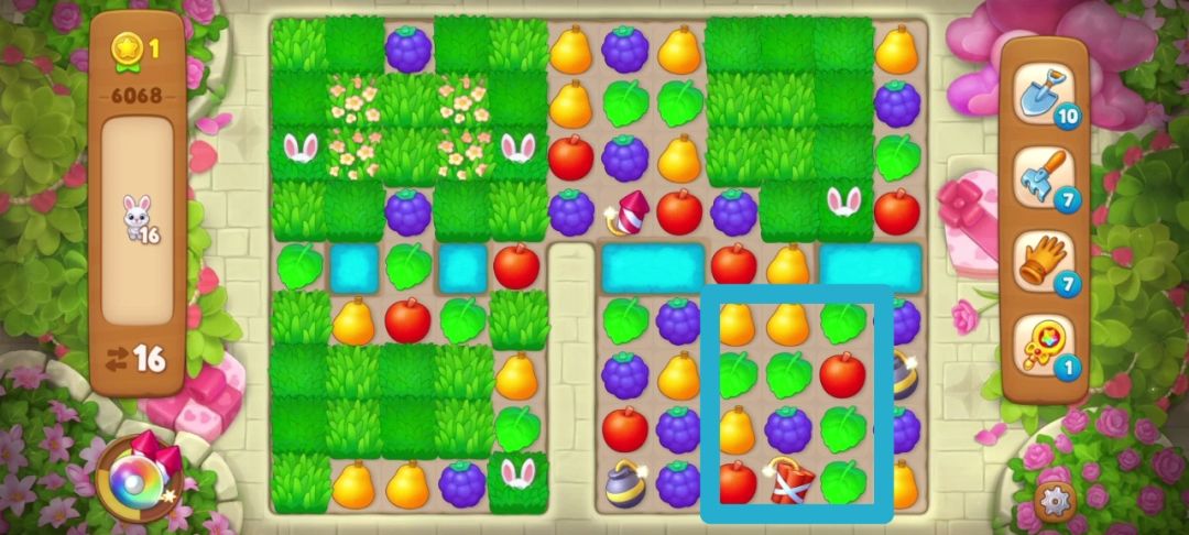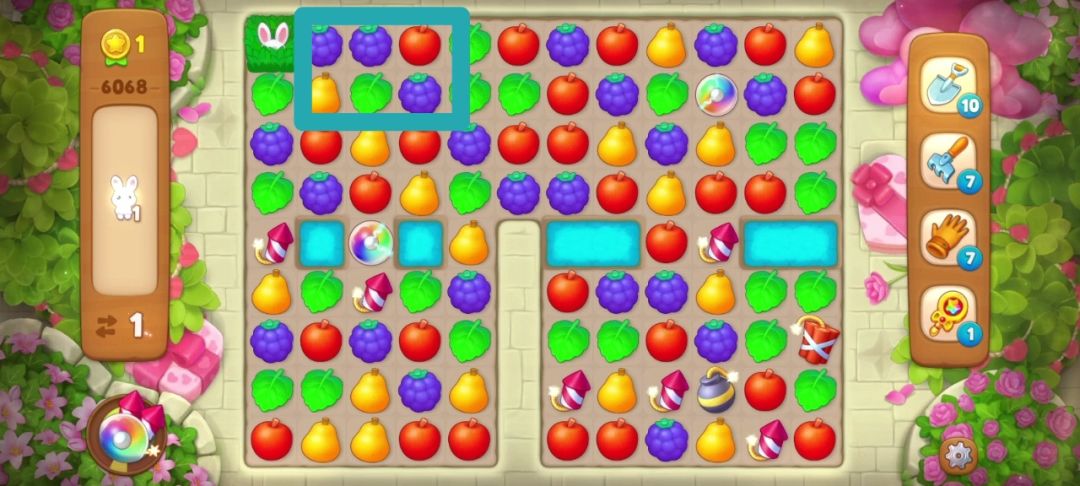 然后掉落又幸运的匹配一次让小兔子只剩最后一个,然后我只要再匹配一次葡萄(蓝框内)就达成了收集目标!惊险通关~