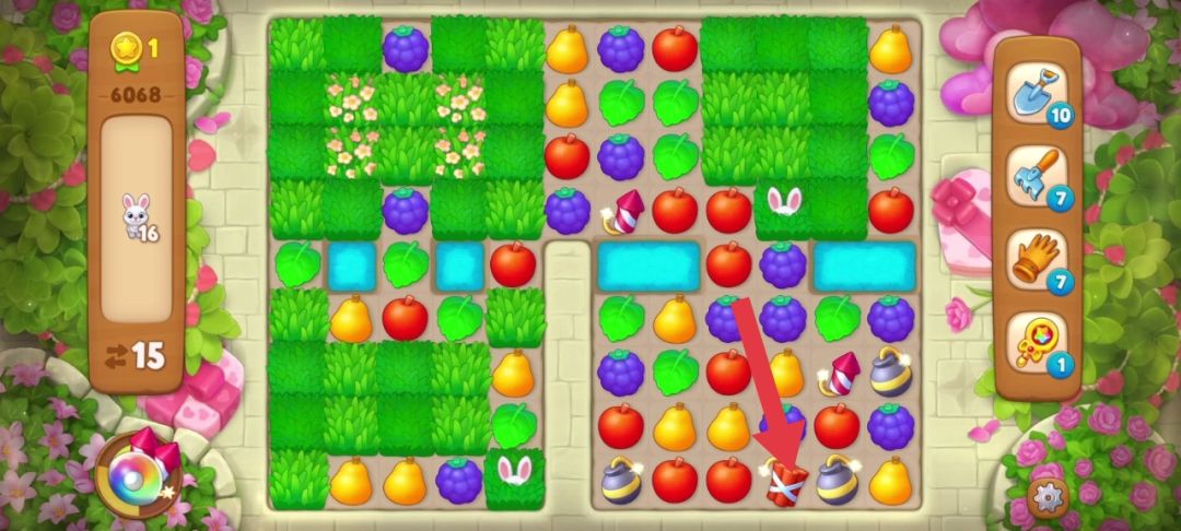 👆用完彩虹球得到上图,左上角的草地还是很密集,并且光标所在位置匹配苹果可以得到一个炸/弹,如下图👇