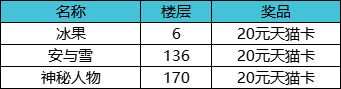 随机抽取3名正确参与活动的玩家,赠送20元天猫卡一份;