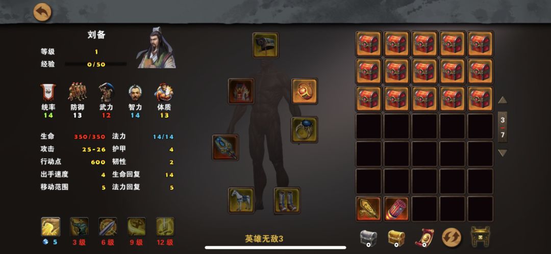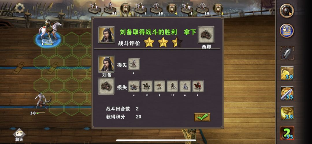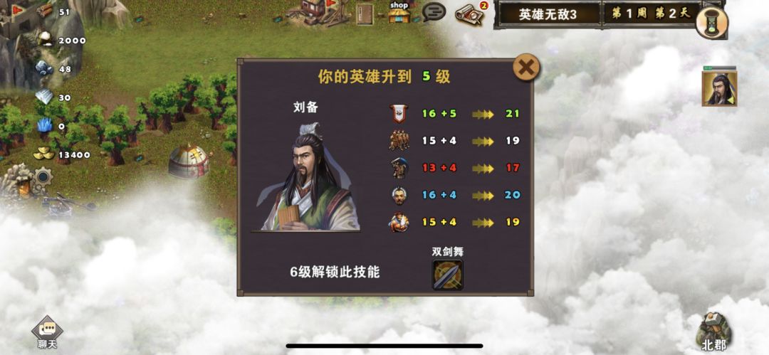 这关和前面一样,还是选刘备,装备使用九天惊雷杖、天罗冠、伏完风衣、太平要术、雷鸣指环、寒风、祥云鞋,兵种使用鹰卫,战术卡使用战前准备、准备就绪、木工术、炼金术,提前给刘备穿好装备,准备一个1级铜雀指环方便前期练级,城池默认的北郡,第一天先占领北郡,然后装备上铜雀指环,城门口有个神行果和全属性宝石可以捡,把农民分组打掉两个小怪就可以升到3级,身上装备的雷鸣指环就可以使用了,再装备一个五蕴方巾可以提升一点属性,随着等级的提升,身上的装备都可以使用了,8级后雷杖可以使用,打怪更轻松,再招募一些神射手升级鹰卫可以去单挑boss了,升到满级后去探索地图看到靶场就招募神射手升级鹰卫,遇到boss就打,小怪不用管,当打完所有boss占领全部城池就可以过关,并且获得战术卡神匠术,附视频、截图,当我刘备升满级后地图上boss才5-6级左右,打boss像切菜一样,说明:地图上敌人势力boss都是随机的,