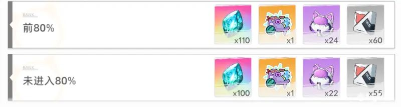 前80%:猫眼石*110 中级武装因子*24(2.4W经验) 悠然一夏徽章*1 武装模块60