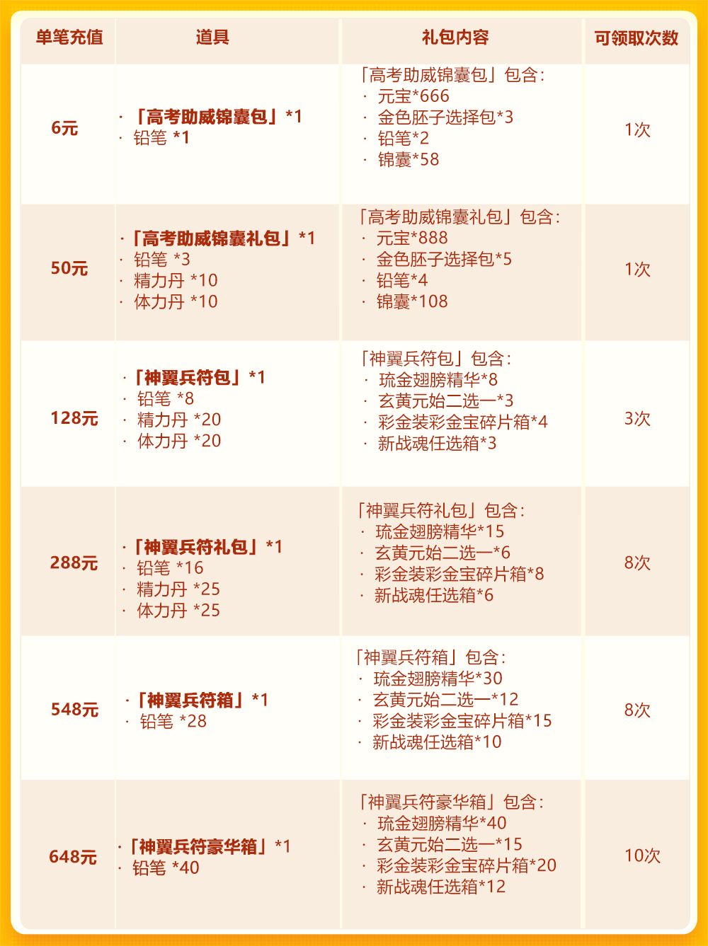 在活动期间少年们单笔充值至指定金额,即可获得琉金翅膀精华、玄黄元始二选一、彩 金装彩 金宝碎片箱、新战魂任选箱、铅笔等资源: