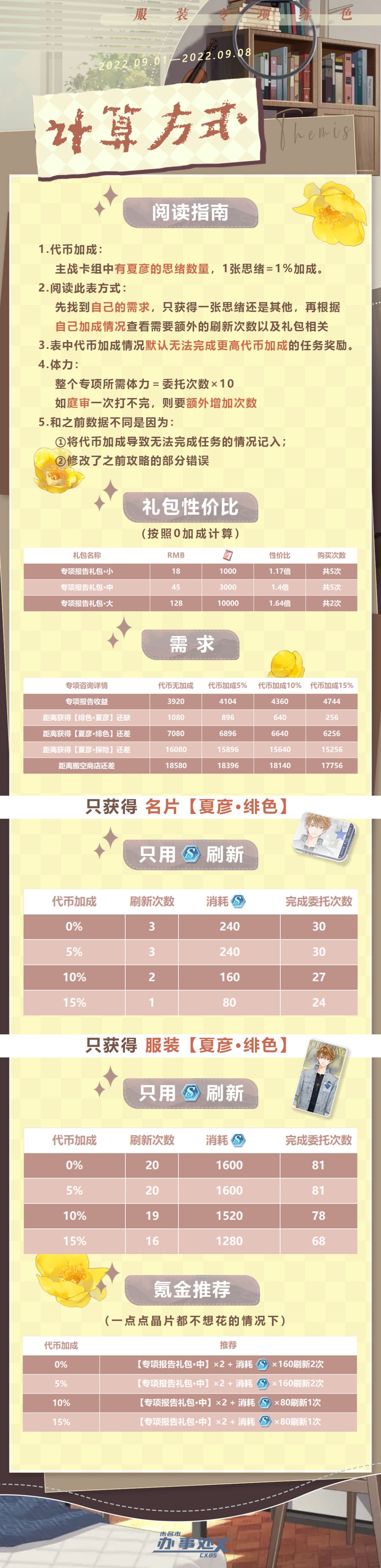 2.阅读此表方式:先找到自己的需求,只获得一张思绪还是其他,再根据自己加成情况查看需要额外的刷新次数以及礼包相关