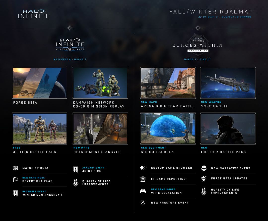 343发布了《光环:无限》秋冬季更新路线图,确认锻造模式(BETA)以及战役合作模式将于2022年11月8日上线,遗憾的是分屏合作模式被完全取消。