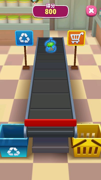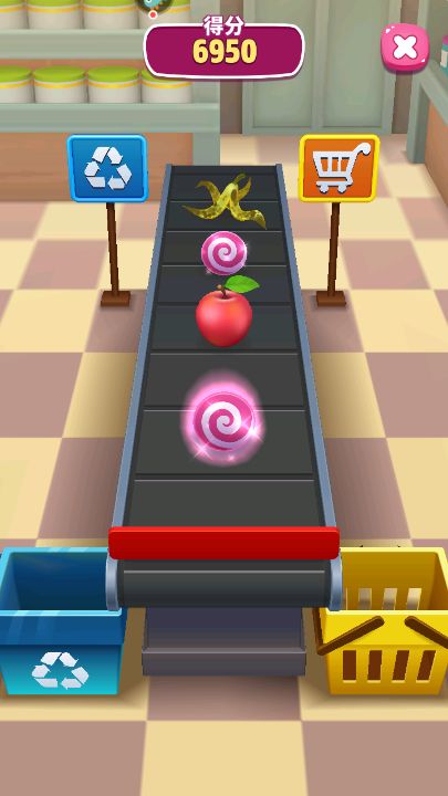 今天这款“零食篮”的游戏需要我们将传送带上的物品进行分类,将坏的放入左侧的篮子进行回收,好的食物放到右侧的购物车。物品还是很好通过颜色进行分类的,蓝,绿色的物品基本上都可以归类到左侧。