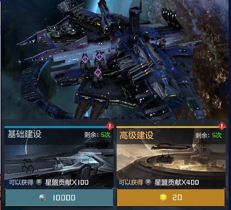 每日可以在星盟中建设,基础建设和高级建设可各建设5次,建可获得星盟贡献币,可在星盟商店中购买所需的舰长碎片、图纸和零件高级战斗卡等等,对于体验游戏前期是比较缺的,特别是女舰长碎片,每日可兑换5次记得兑换不要浪费次数哦。