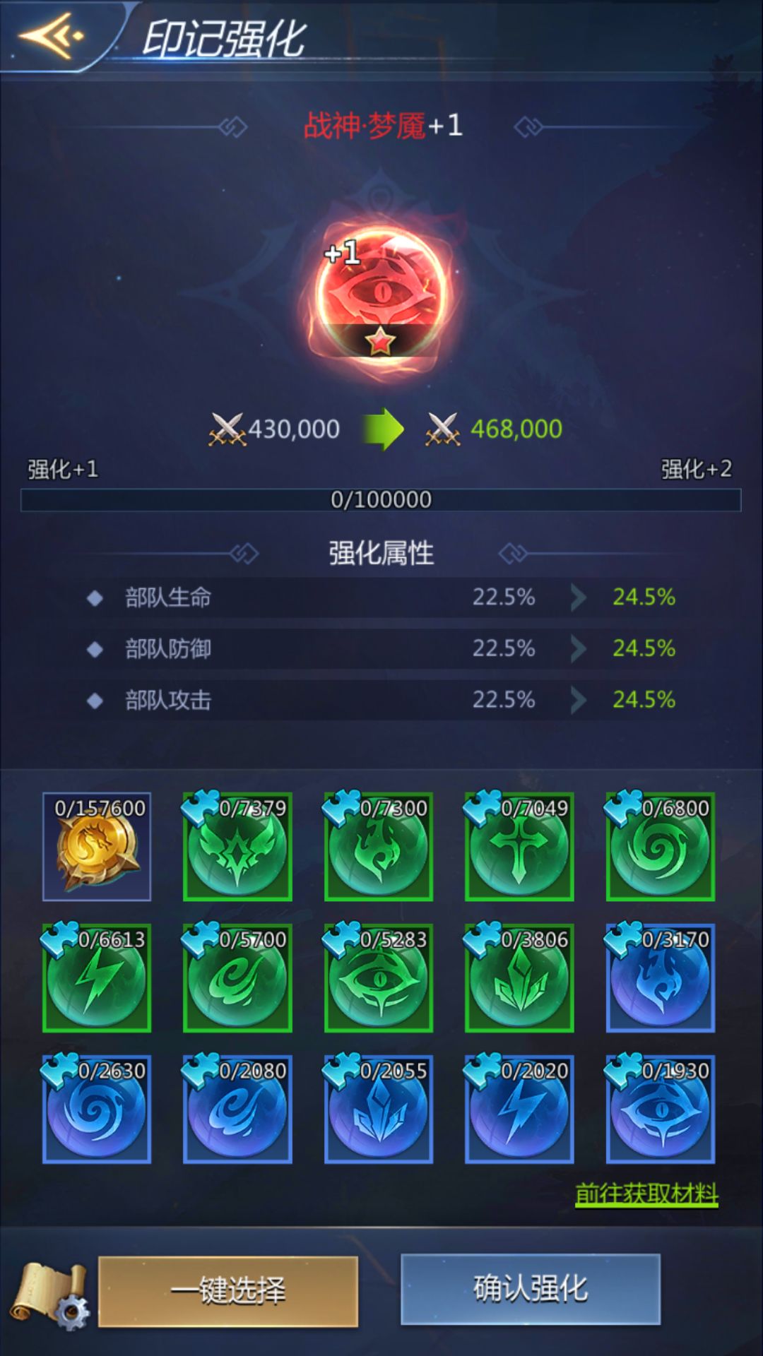 印记 或 印记仓库界面,点击要强化的印记,点击界面的“强化”