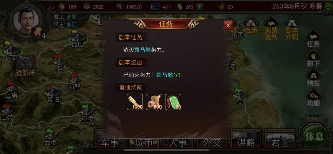 消灭了司马懿势力却没有奖励,是因为提前斩首了司马懿出bug了吗?