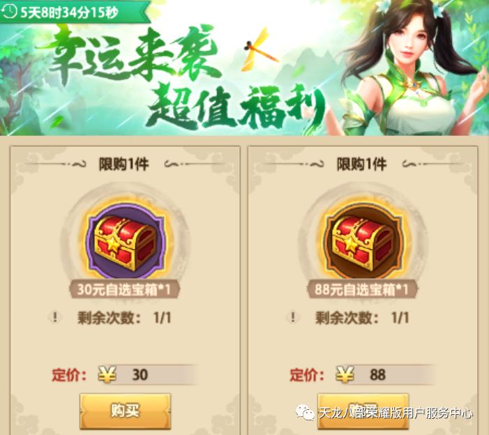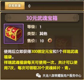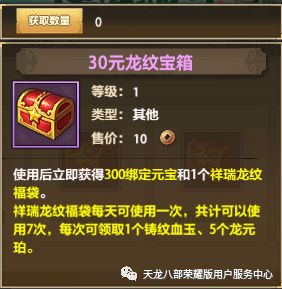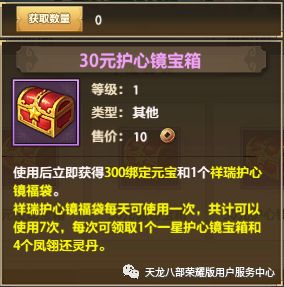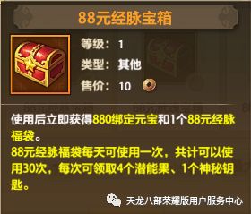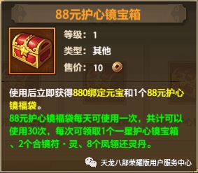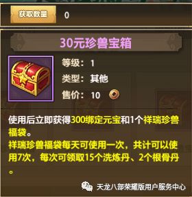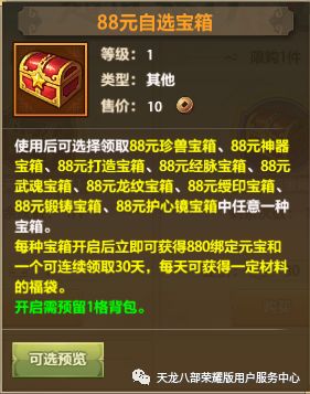 自选宝箱购入后立即返还等额的绑元,宝箱还可选择开启珍兽、神器、打造、经脉、武魂、龙纹、绶印、锻铸、护心镜九种材料的福袋中任意一种。30元福袋可连续领取7天珍稀材料;88元福袋可连续领取30天珍稀材料;两种宝箱内容详情如下,下滑附超详细材料表格: