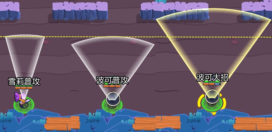 通过对比可以发现,波克的射程属性比较优秀,和玩家比较熟悉的雪莉相差无几,但扇形攻击的夹角幅度比雪莉更大,实战中更易于同时进攻到多名敌人。
