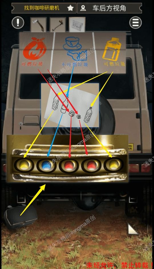 31.车后方视角,对照垃圾分类图案,将【纸条】上的物品进行分类,找到对应的颜色(黄、蓝、红、红、黄),查看左下角的包,将密码锁调整为对应【纸条】物品的颜色(黄、蓝、红、红、黄),得到【咖啡研磨机】,和【把手】组合。31