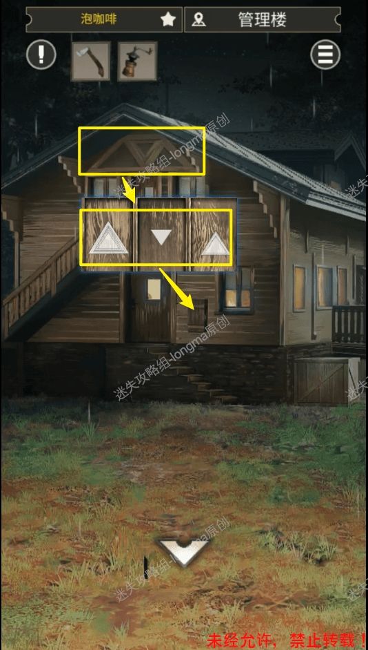 32.管理楼,查看门口木箱,对照二楼门上方的三角图案(大三角·上、小三角·下、中三角·上),调整箱子密码锁,开启箱子,获得【钥匙】。32