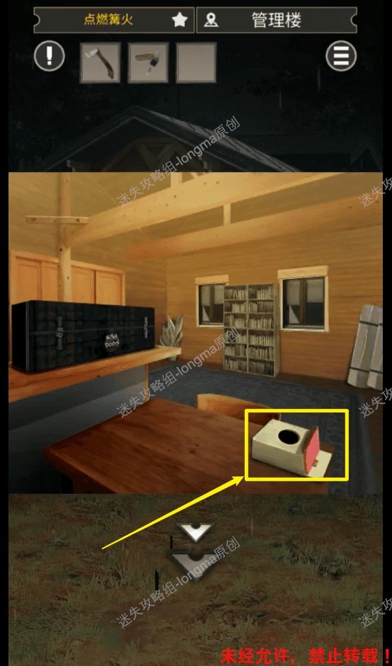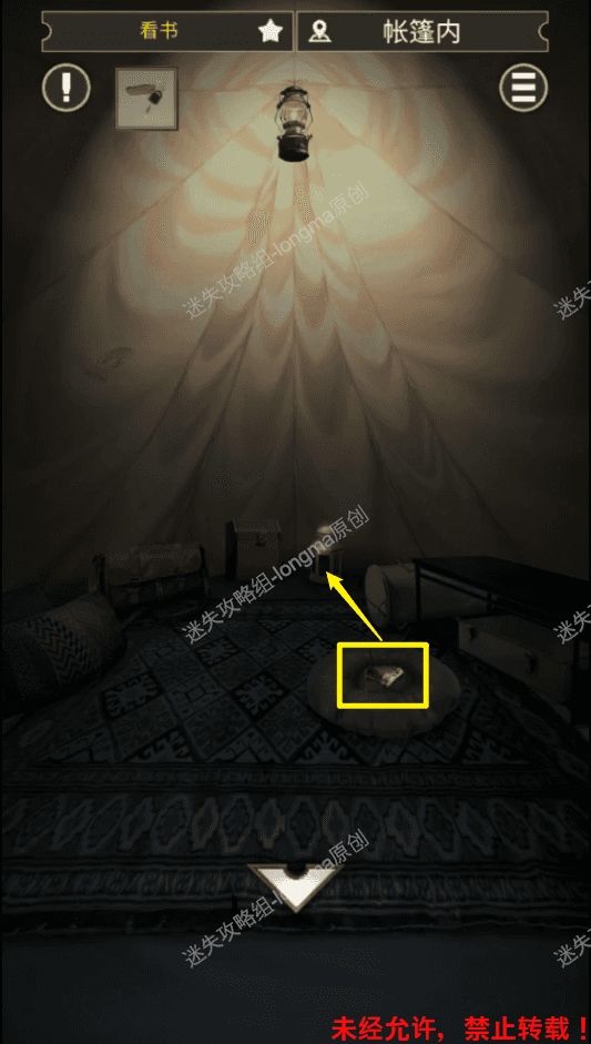 48.帐篷内,拾取坐垫上的【打火机】,将地上的油灯点亮。48