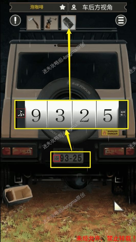 58. 车后方视角,根据【睡袋包】上的汽车标致提示,查看车牌,在【睡袋包】的密码键盘上点击车牌号9325,获得【睡袋】。