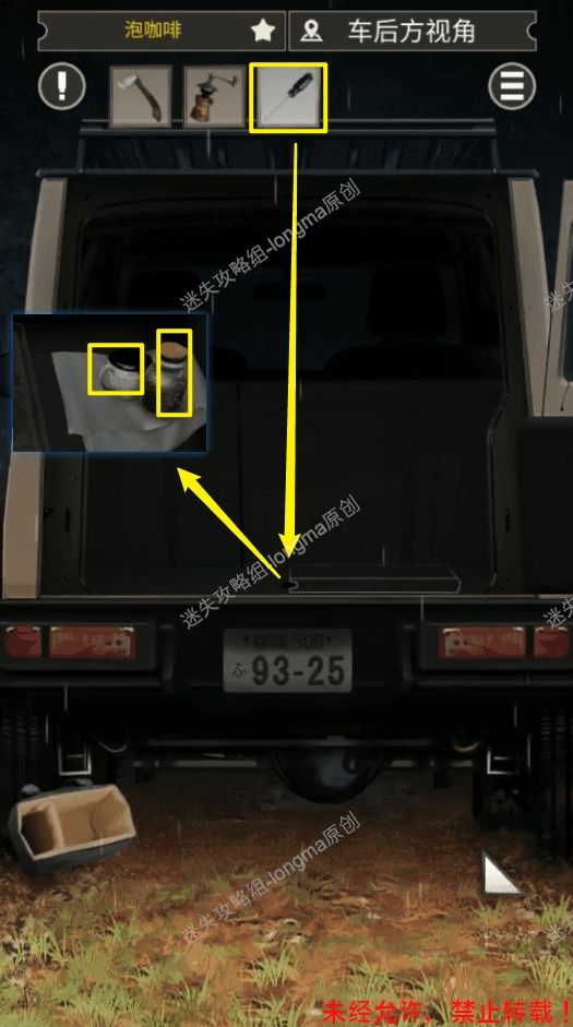 37.车后方视角,使用【螺丝刀】打开后备箱底部,获得【咖啡杯】【咖啡豆】。37