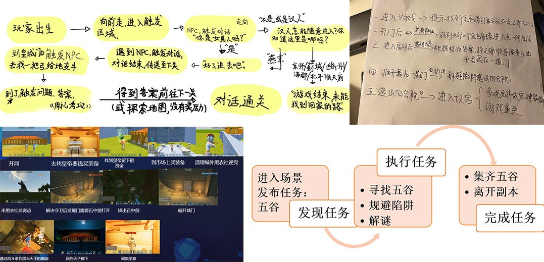 在导师的指导下,学员们纷纷开动脑筋,写下自己的想法,并将这些想法逐步拆分,制作出游戏流程图与策划方案。同时根据对故宫这座中轴建筑的了解,将自己对游戏的想法与中轴建筑元素结合在一起。