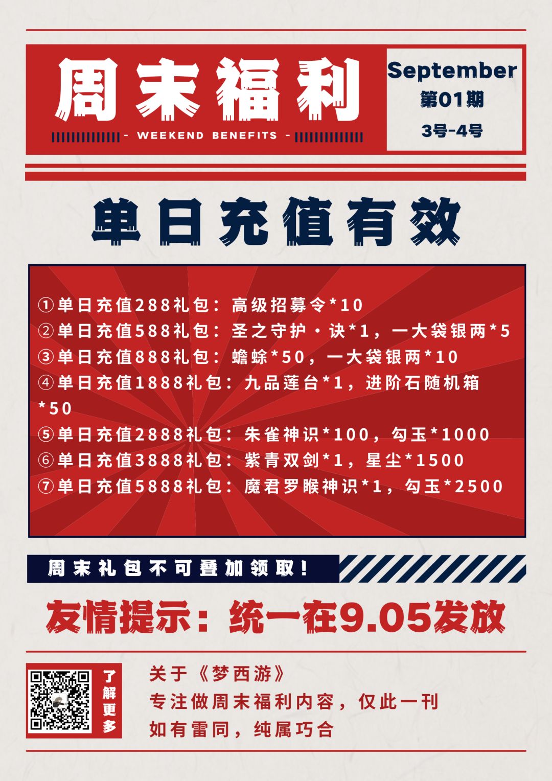 周末福利丨《梦西游》9月3日至9月4日充值返利来啦~