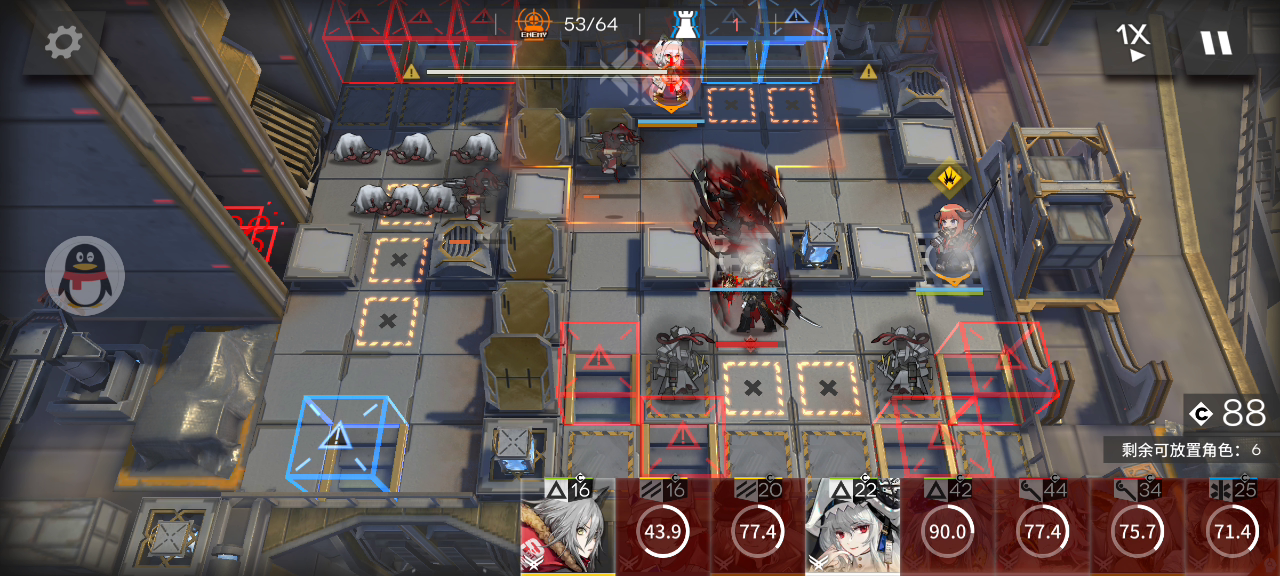 再部署澄闪控血,大概在城防炮满的时候鲨曼弗雷德一阶段,转阶段红、桃先后吃炮,二阶段时水月、鸟笼、蜜蜡承伤给城防炮充能,澄闪吃炮带走右侧触手,夜莺被炸死前留一个鸟笼。