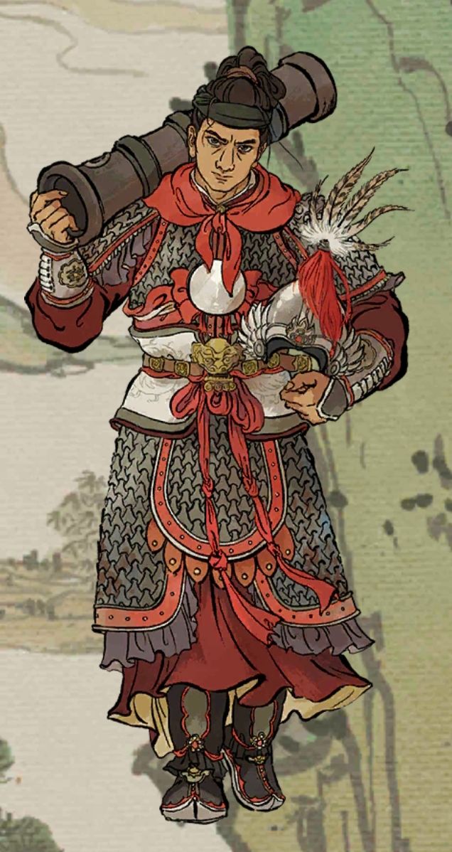 戚继光给戚家军装备的火炮又称为“虎蹲炮”,因为其射击的样子像猛虎蹲坐的样子,所以得名。立绘中戚继光手中拿着的火炮便是虎蹲炮。